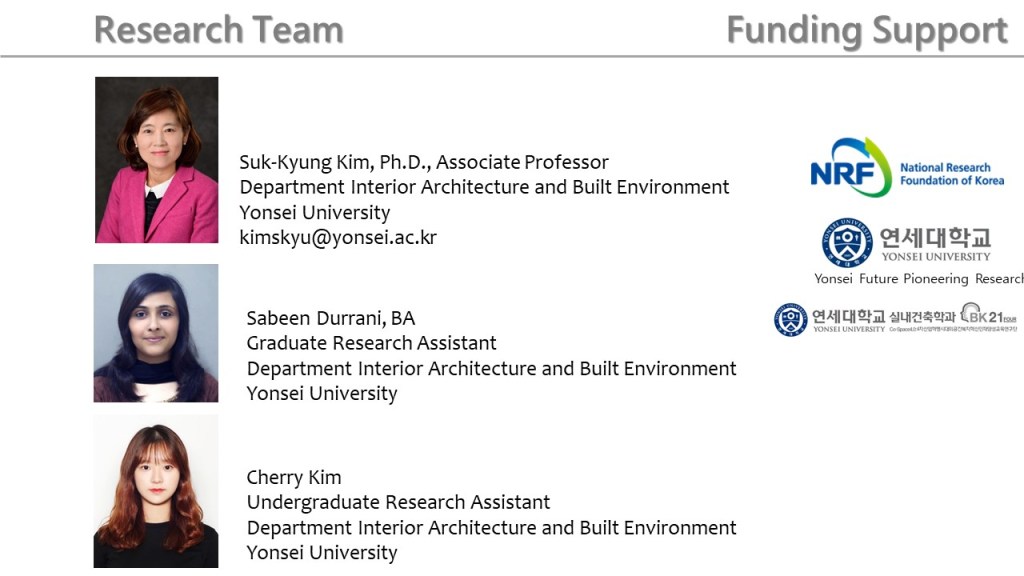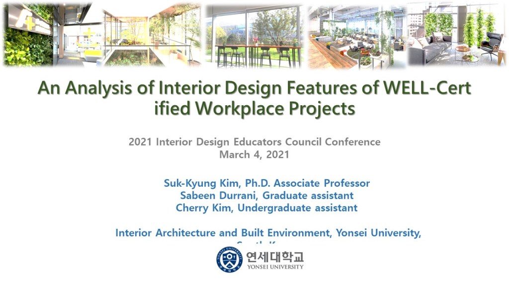 - Interior Design Educators Council Conference: An Analysis of Interior Design Features of WELL-Certified Workplace Projects, March 2021. Suk-Kyung Kim, Sabeen Durrani, Cherry Kim.
